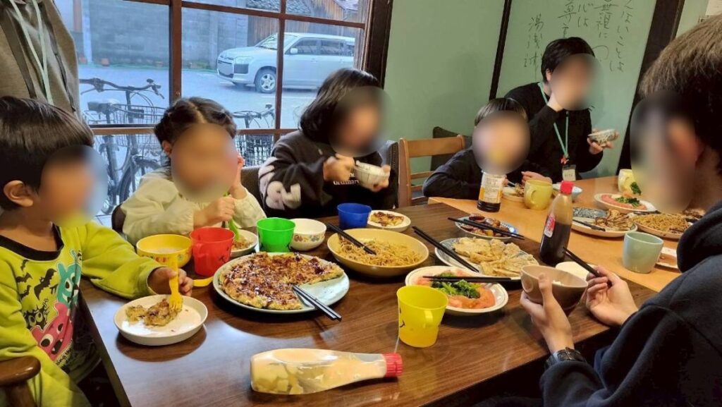 子どもたちとスタッフが一緒にご飯時間 みんなで楽しく食事をとり、笑顔溢れる時間です! -