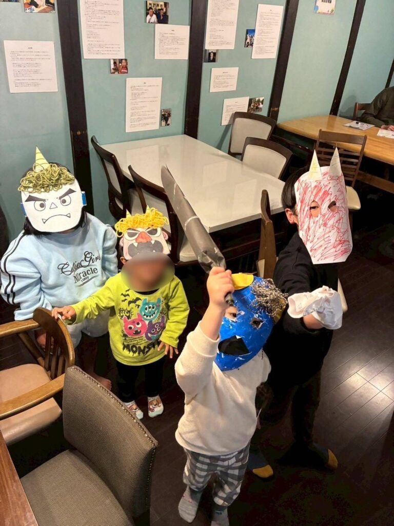 こんにちは! 2月2日、2月3日に節分ごっこ 恵方巻き作りと、お面を手作りしました! 子どもたちと豆まきもして、楽しい節分になりました! -