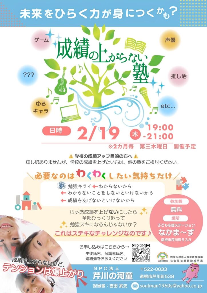 2月19日の19:00~20:30 子ども応援ステーションなかま~ずにて「成績の上がらない塾」を開催します! 成績の上がらない塾では、毎回変わる講師の趣味全開のテーマで、知... -